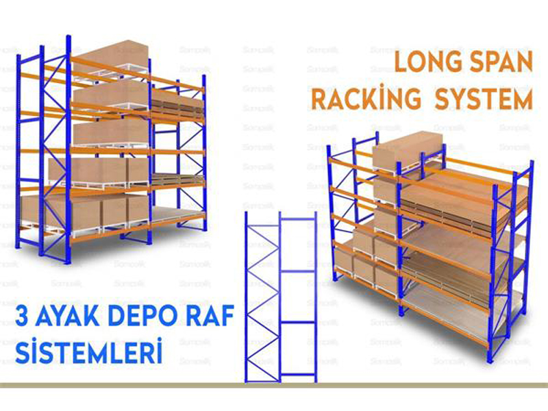3 Ayak Depo Raf Sistemleri, sırt sırta depo raf sistemlerinin bir başka uygulamasıdır. Arka arkaya 2 palet derinliğin de yükleme yapılmakta olup. bu şekilde daha az koridor kullanılarak aynı alanda daha fazla depolama kapasitesi sağlanır.