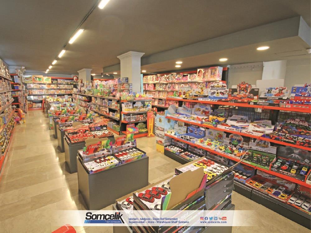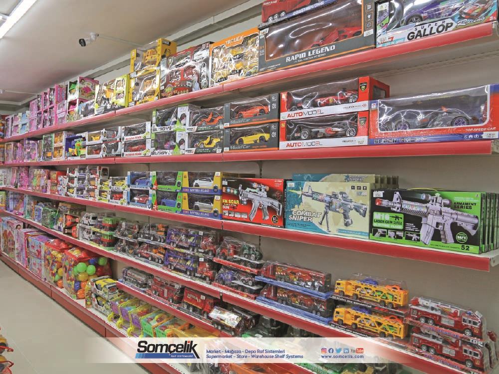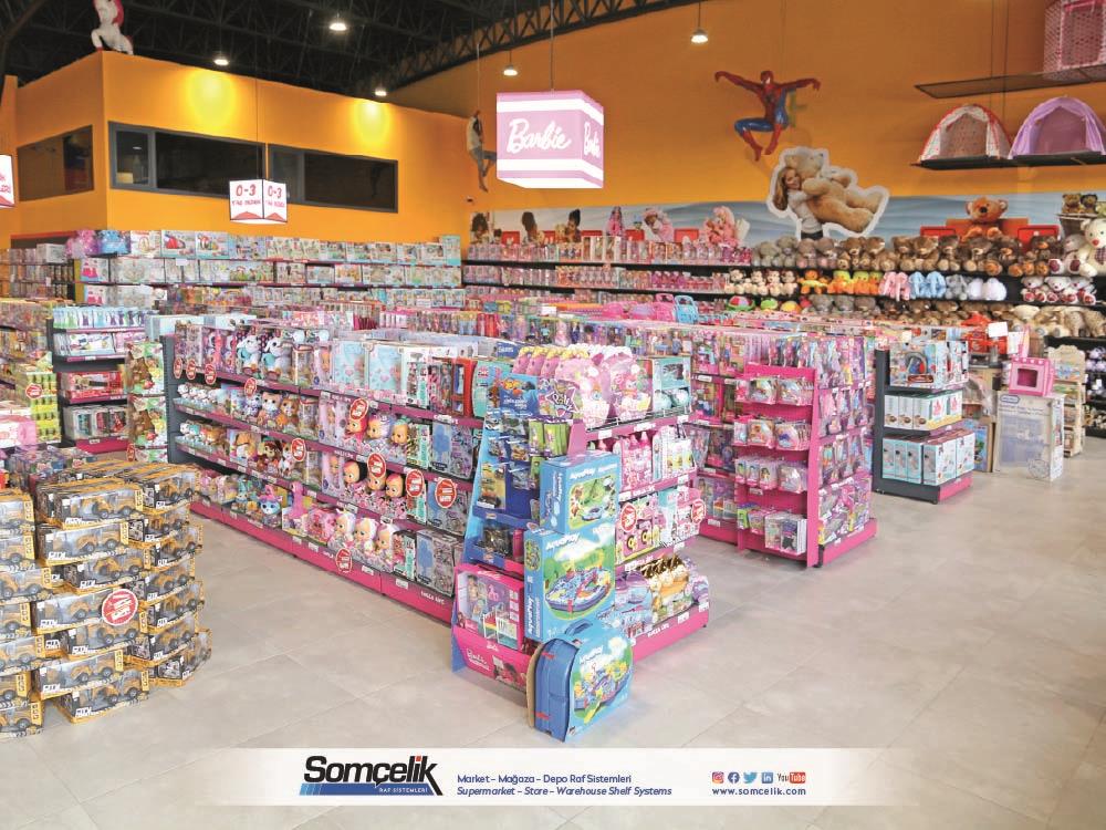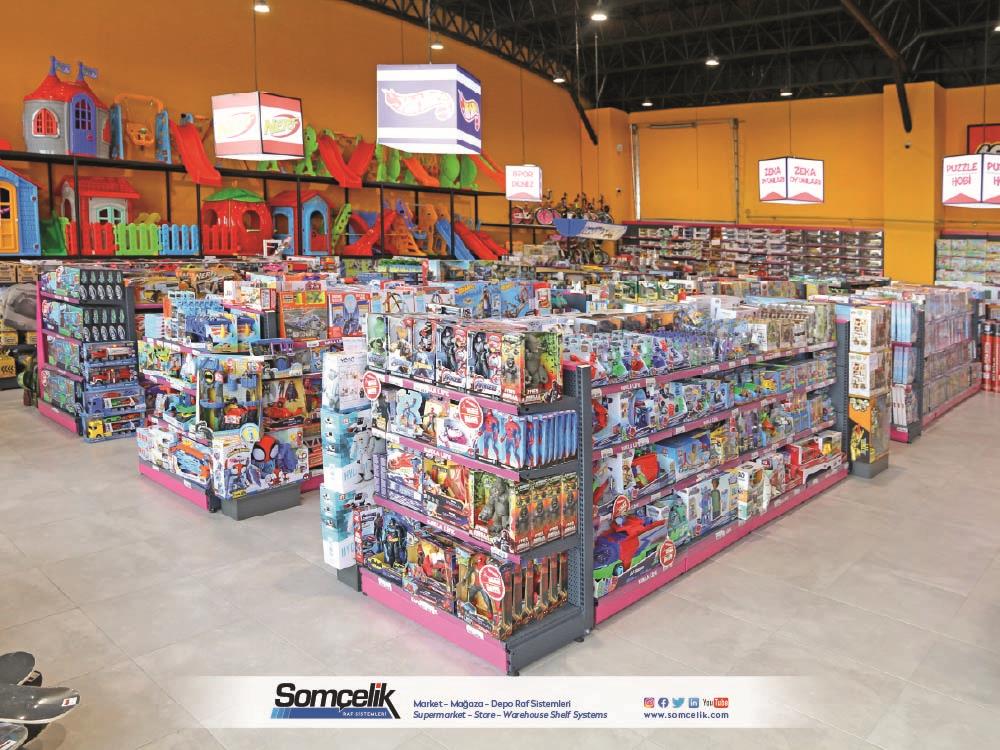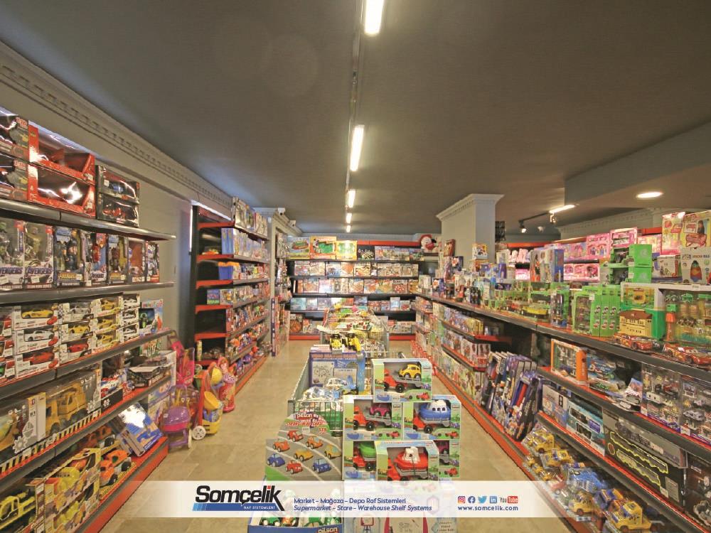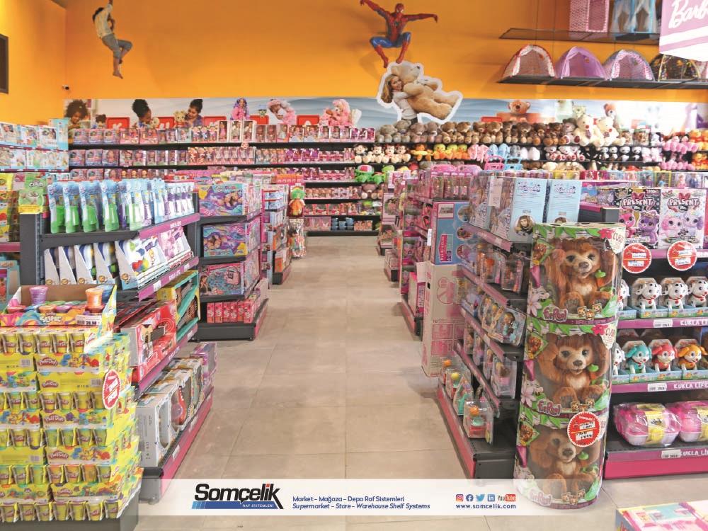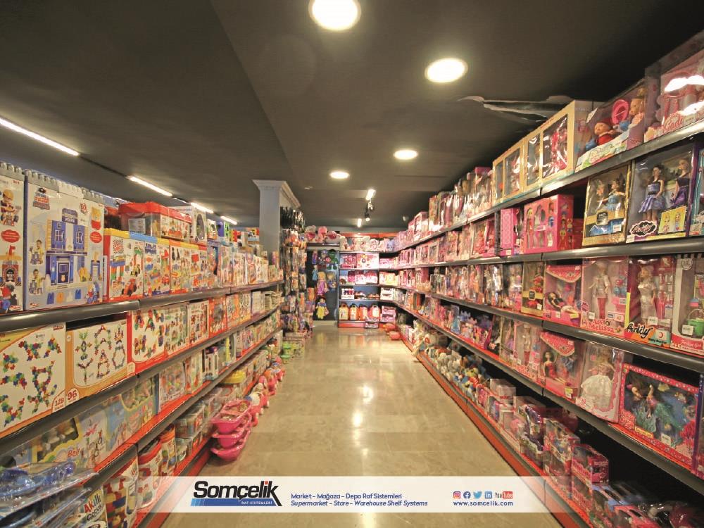 Oyuncak mağazaları çocukların ve ailelerin eğlenceli zaman geçirmek ve yeni oyun arkadaşları bulmak için sıkça ziyaret ettiği yerlerdir. Bu mağazalarda çeşitli oyuncaklar ve oyun setleri bulunur. Oyuncakların düzenli bir şekilde sergilenmesi müşterilerin kolaylıkla görmesini ve seçmesini sağlarken aynı zamanda mağazanın da çekici bir görünüm sunmasını sağlar. Oyuncak mağazası raf sistemleri üretimi yapan Somçelik oyuncakların düzenli bir şekilde sergilenmesi ve mağaza içinde etkileyici bir görsel sunumun sağlar.