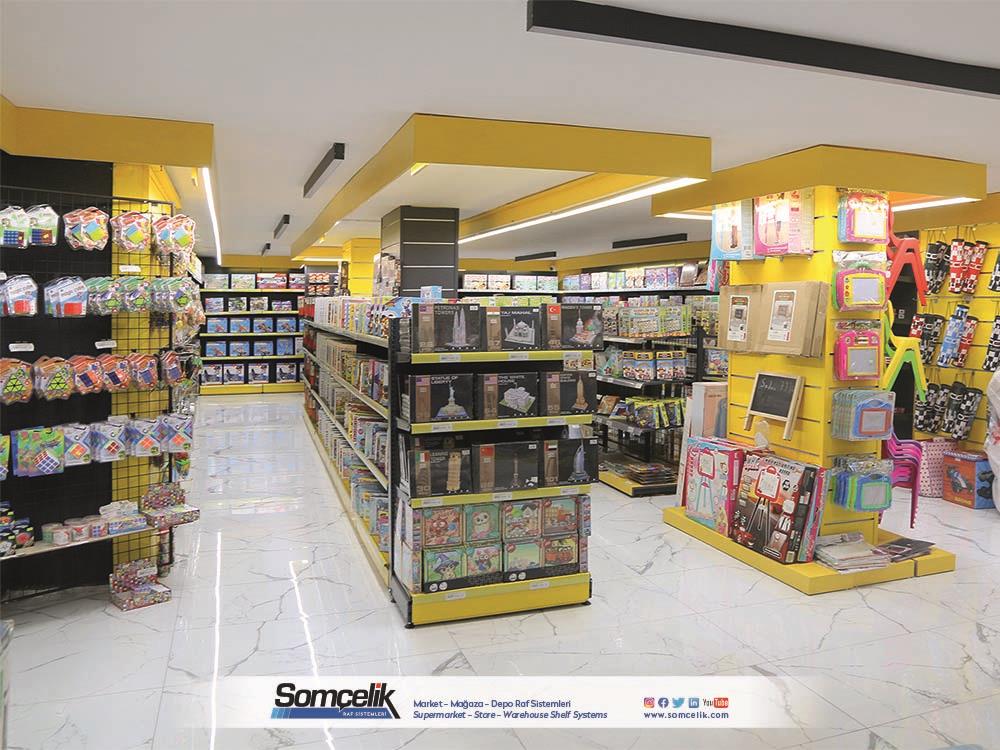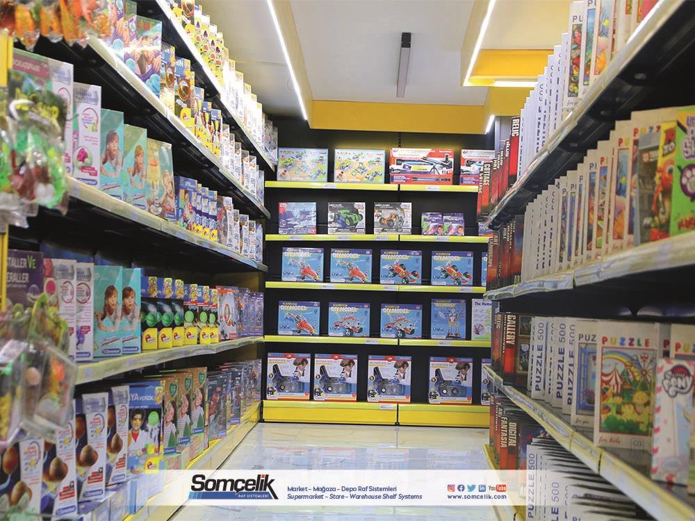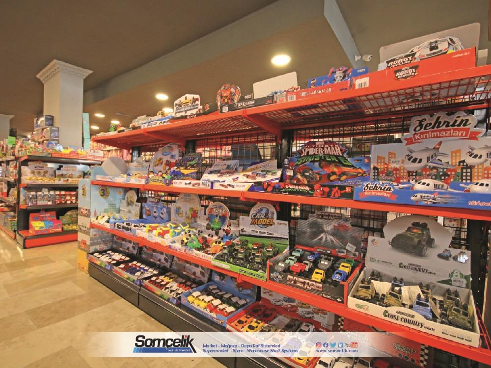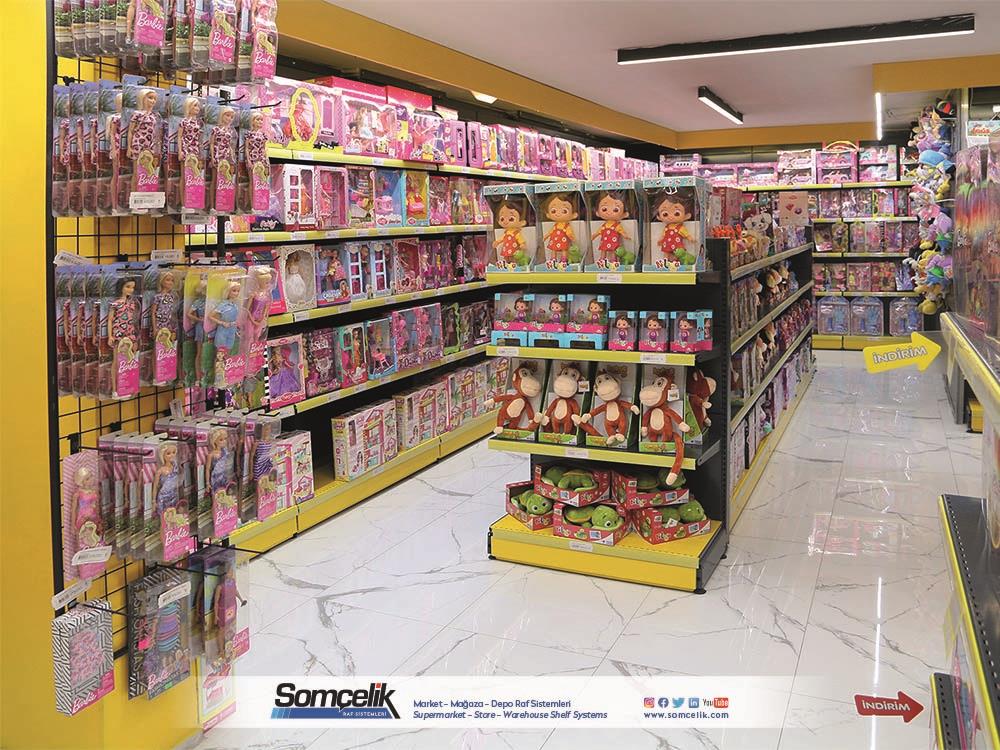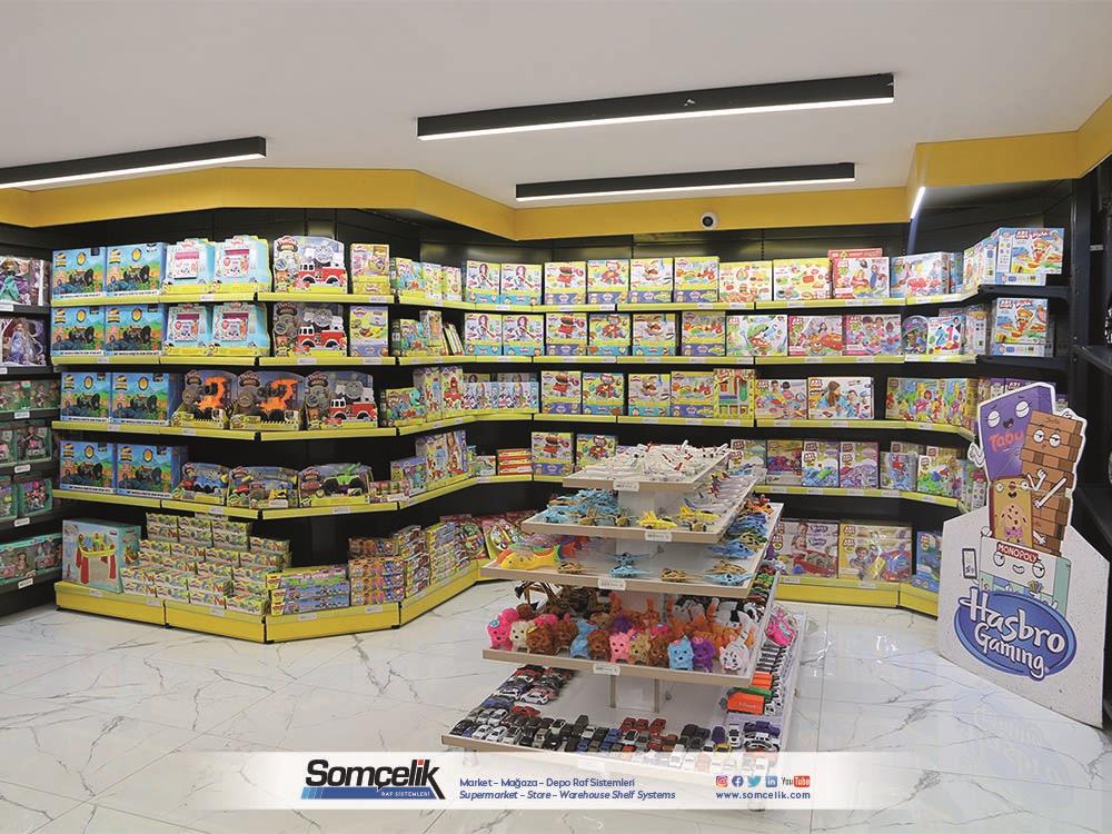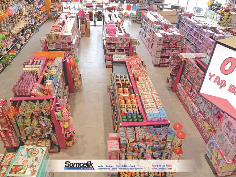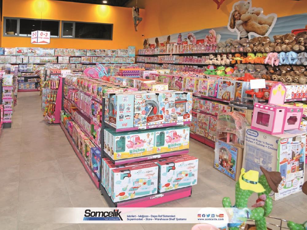 Oyuncak mağazaları çocukların ve ailelerin eğlenceli zaman geçirmek ve yeni oyun arkadaşları bulmak için sıkça ziyaret ettiği yerlerdir. Bu mağazalarda çeşitli oyuncaklar ve oyun setleri bulunur. Oyuncakların düzenli bir şekilde sergilenmesi müşterilerin kolaylıkla görmesini ve seçmesini sağlarken aynı zamanda mağazanın da çekici bir görünüm sunmasını sağlar. Oyuncak mağazası raf sistemleri üretimi yapan Somçelik oyuncakların düzenli bir şekilde sergilenmesi ve mağaza içinde etkileyici bir görsel sunumun sağlar.